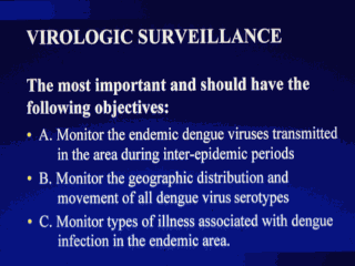 dengue. Virologic surveillance should have the following objectives: 1. Monitor the endemic dengue viruses transmitted in the area during inter-epidemic periods. 2. Monitor the geographic distribution and movement of all dengue virus serotypes. 3. Monitor types of illness associated with dengue infection in the endemic area. For maximum efficiency, the surveillance system must be adaptable to changes in disease incidence. As Aedes aegypti infestation increases, vector surveillance becomes important for prioritizing and stratifying areas for intervention and for monitoring the effect of control efforts; disease surveillance now becomes necessary in order to detect the introduction and transmission of dengue virus. Nevertheless, the aim of active virologic surveillance, the most important element, is to monitor dengue transmission, giving emphasis to periods of sporadic or silent transmission, so as to quickly detect introduction of new virus strains or serotypes. Nevertheless, the aim of active virologic surveillance, the most important element, is to monitor dengue transmission, giving emphasis to periods of sporadic or silent transmission, so as to quickly detect introduction of new virus strains or serotypes. Other important components are surveillance for increased fever activity and for viral syndromes with fatal outcomes. Individually, none of these components is necessarily very sensitive, but collectively the three together provide the most sensitive data obtainable for predicting epidemic dengue. Furthermore, when used in conjunction with entomologic data they provide the basis for action by a rapid response emergency vector control unit seeking to control an incipient epidemic before it spreads. However, it must be emphasized that effective surveillance for dengue and dengue hemorrhagic fever/dengue shock syndrome is not possible without a diagnostic laboratory that can perform serologic and virologic diagnostic tests that are both rapid and sensitive. This is a major problem in many dengue-endemic countries. |