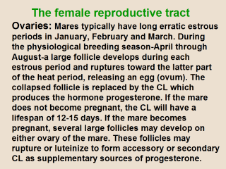 help propel the egg towards the uterus. Uterus: The uterus contains a body and 2 horns. See illustration. The horns connect the uterus to the fallopian tubes and are about 26 cm long. The body is connected to each horn at roughly 90 degrees and about 20 cm long. The lining of the uterus is generally light pink in color and is made of longitudinal folds. The lining is termed the endometrium. Cervix: It is a muscular structure about 10 cm long. The cervix separates the uterus and the vagina. During pregnancy the cervix of the mare becomes quite firm and hard, and the external opening becomes sealed. Vagina: The vagina extends from the cervix to the vulva and is about 18 cm. The hymen is usually not present. Vulva: The vulva is the terminal part of the reproductive tract. It is about 10 cm long. The external orifice is a vertical slit about 17 cm long with the clitoris at the bottom. |