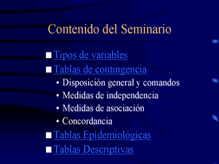 Primero repasaremos los tipos de variables usados en estadística. Luego entramos a tratar sobre tablas de contingencia y sus medidas de independencia y asociación. También hablamos de pruebas de concordancia y de tipo epidemiológico (riesgo relativo y odds ratio). Finalmente revisaremos brvemente las tablas de tipo descriptivo y de agrupamiento que ofrece SPSS. |