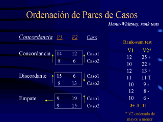 Algunas medidas de asociación se basan en pruebas no paramétricas de rangos (rank tests) similares a las de Wilcoxon o Mann-Wittney. Decimos que dos casos o sujetos son concordantes para un par de variables si su cuando el valor de una aumenta el otro lo hace del mismo modo. Son discordantes si al aumentar el valor de una variable la otra disminuye. Existe un empate (tie) si al variar una variable la otra no se modifica. En las pruebas no paramétricas de rangos (rank-tests) primero se ordena una variable y luego se observa la concordancia o discordancia para cada par de casos. También puede usarse para ver si los valores de una variable son sistemáticamente mayores o menores que los de la otra, en cuyo caso puede establecerse que son distintas (rank-sum test, que da el estadístico U de Mann Whittney). En el ejemplo de la derecha, no hay diferencias valorables ya que V2 es mayor que V1 en tres ocasiones, menor en otras tres, y en una hay empate. |