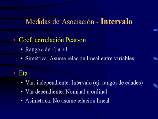 Son poco utilizadas en tablas de contingencia, ya que es más apropiado con este tipo de variables usar pruebas de correlación. Solo son apropiadas en variables de intervalo. |
