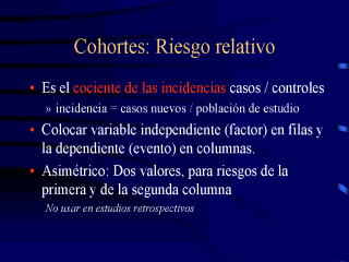 En estudios de cohortes o prospectivos (diseño experimental) conocemos exactamente el número de sujetos expuestos y no expuestos al factor de estudio, por lo que podemos determinar la incidencia de eventos en ambos grupos. Es el procedimiento ideal para estudios de causa-efecto. |