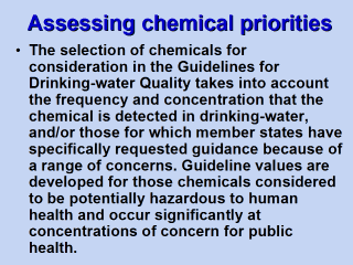| The selection of chemicals for consideration in the Guidelines for Drinking-water Quality takes into account the frequency and concentration that the chemical is detected in drinking-water, and/or those for which member states have specifically requested guidance because of a range of concerns. Guideline values are developed for those chemicals considered to be potentially hazardous to human health and occur significantly at concentrations of concern for public health. |