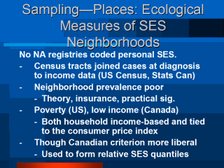In the construction of our central ecological measure of SES we focused on the prevalence of federally-defined poor people within census tracts for the following reasons. Census tracts are the most comparable units used by both the US Census Bureau and Statistics Canada. Much construct validation of such units has been accomplished, particularly by sociologists in the US (e.g., poverty areas; William Julius Wilson, The truly disadvantaged, 1987; Paul Jargowsky, Poverty and Place, 1997). Much predictive validation of such units has been accomplished, particularly in the US (e.g., Krieger N et al. The Public Health Disparities Geocoding Project. Am J Epidemiol 2002). 4) Such income-based measures are known to be intimately associated with various under- and uninsured statuses in the US, and thus, are close proxies of them. |