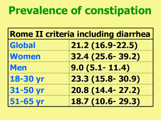 The slide shows the prevalence of constipation according to Rome II criteria, but including subjects presenting loose or watery stools.