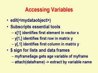 dataframes or vectors. Use dollar signs ($) to extract specific variables