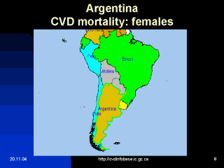 | Overall, North America has very low CVD mortality rates relatively speaking, for both males and females. The concern is that these rates and the risk factors associated with them are increasing. In Argentina the mortality from CVDs for females is much lower at 176.65 per 100,000 population, about 37.55% of all deaths (1996) |