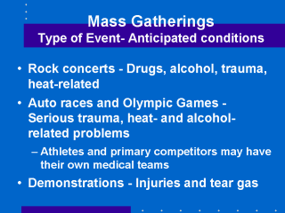 | Anticipate different types of medical conditions based on the type of event. Specialized units such as rehydration, vehicular trama , VIP-care. might be needed depending on the type of event in order to care to the specific needs of your patient population. |