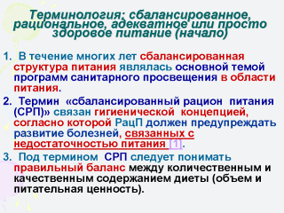 1] Употребление разнообразных продуктов питания также служит гарантией ослабленного действия любого токсичного элемента, присутствующего в том или ином продукте питания. [2] Рациональное зерно концепции потребления нескольких различных пищевых продуктов заключается в том, что в этом случае один из продуктов, богатый каким-то определенным питательным веществом, сможет восполнить недостаток этого питательного вещества в другом пищевом продукте. |