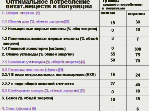 населения в среднем должен составлять 20-22 в кг/(рост в метрах) [2] Уменьшая потребление жира до 15% общей энергии добиваются благоприятных эффектов. [3] Потребление как минимум 400 г овощей и фруктов в день, в том числе 30г. бобовых, орехов и семян. [4] Пищевая клетчатка включает в себя некрахмальные полисахариды(НКП), оптимальный показатель потребления которых рассчитан на основе НКП, полученных из смешанных источников пищи. [5] Эти сахара включают в себя моносахариды, дисахариды и другие короткоцепочные сахара, получающиеся при очищении углеводов. (Диета, питание и профилактика хронич. заболеваний, ВОЗ, 1990г.) |