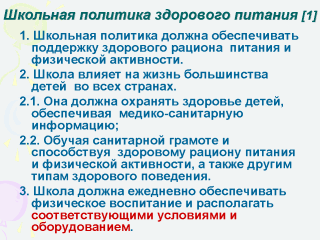 5. Школьная администрация, вместе с другими ответственными органами, должна рассмотреть возможность заключения контрактов с местными производителями продовольствия на поставки продуктов для школьных завтраков, чтобы обеспечить местный рынок для здоровых пищевых продуктов.[1] Глобальная стратегия ВОЗ в области рациона питания, физической активности и здоровья (утверждена Всемирной ассамблеи здравоохранения, резолюция 57.17 от 22 мая 2004 года) |