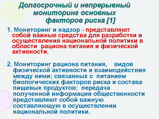 детерминантами эффективных программ вмешательства). 4. Необходимо больше информации, особенно о положении в развивающихся странах, где создание программ в отношении здорового режима питания и физической активности должно быть оценено и интегрировано в более широкие программы развития и искоренения бедности.[1] Глобальная стратегия ВОЗ в области рациона питания, физической активности и здоровья (утверждена Всемирной ассамблеи здравоохранения, резолюция 57.17 от 22 мая 2004 года) |