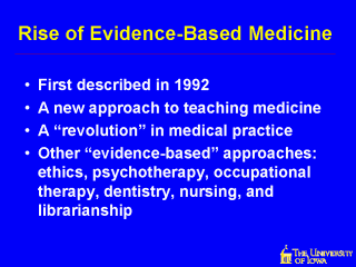 | Evidence-Based Medicine (EBM) was first described in 1992. It was hailed as a new approach to teaching medicine and was once described in the New York Times as a "revolution" in medical practice. EBM has spawned a host of "evidence-based" approaches including: ethics, psychotherapy, occupational therapy, dentistry, nursing, and librarianship. |