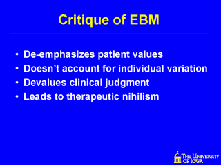 criticisms are listed here. The definition of EBM explicitly requires consideration of clinical experience and patient values, which argues against the first and third charges. One can argue, of course, whether or not EBM is actually practiced this way. Medicine and science are based upon observing patterns and probabilities. The fact that no vaccine has 100% effectiveness, due to individual variation, does NOT mean that one should fail to be aware of consensus guidelines regarding immunizations and ignore such guidelines in practice. Thus, the second critique can be subject to counterargument. The final criticism, that EBM can lead to "therapeutic nihilism" (doing nothing if there aren't extensive randomized controlled trials justifying an intervention) has also been challenged in that EBM relies on the best available evidence not on an idealized standard. |