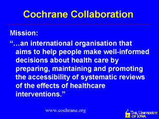 | One of the key resources that has enabled the development and practice of both EBM and EBPH is the Cochrane Collaboration. Its mission is stated in this slide. |