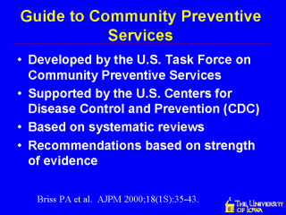 | Another important resource for EBPH is the Guide to Community Preventive Services (www.thecommunityguide.org). The Guide uses a defined, evidence-based approach to develop recommendations for addressing a number of important public health problems. |