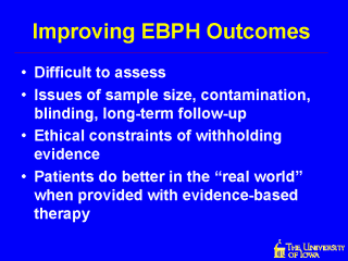 It is important to improve our ability to know that an EBPH intervention achieved its desired outcome. However, formal evaluation of EBPH is difficult for the reasons listed in this slide. We do know, however, from outcomes research that patients do better in the "real world" when provided with evidence-based therapy (e.g., beta-blocker and aspirin after a heart attack; provision of recommended clinical preventive services). They also do worse when provided with therapy that lacks evidence (e.g., carotid endarterectomy patients not meeting EBM guidelines have a much higher risk of stroke and death). |