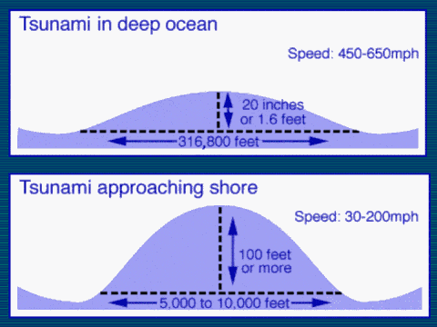 & ocean depth: "The speed at which tsunamis travel depends on the ocean depth. Tsunamis are shallow-water waves, which means that the ratio between water depth and wavelength is very small. These shallow-water waves move at a speed equal to the square root of the product of the acceleration of gravity (9.8m/s/s) and the water depth. Notice how the waves become larger as they reach shore, where the water is shallower. When the tsunami enters the shoaling water of coastlines in its path, the velocity of its waves diminishes and the wave height increases (shoaling effect). It is in these shallow waters that a large tsunami can crest to heights exceeding 100 feet (30 m) and strike with devastating force. A tsunami can exceed 500 mph (and a period of about one hour) in the deep ocean but slows to 20 or 30 mph in the shallow water near land. In less than 24 hours, a tsunami can cross the entire Pacific Ocean. In summary, The deeper the water, the faster the wave is, vise versa. Shoaling effect results in a tsunami that was imperceptible in deep water may grow to be several feet or more in height in the coastlines." Citation source: http://www.owlnet.rice.edu/~esci108/108_EQ_Lec_4.ppt |