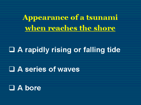 Tsunamis rarely become great, towering breaking waves. Sometimes the tsunami may break far offshore, or it may form into a bore: a step-like wave with a steep breaking front. A bore can happen if the tsunami moves from deep water into a shallow bay or river. |