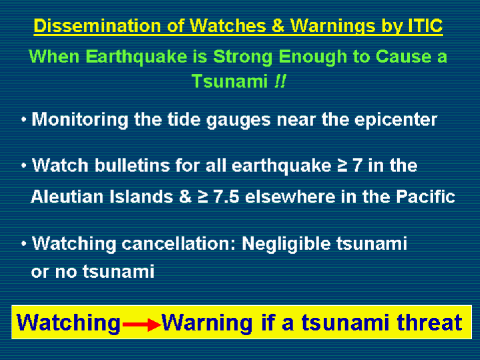 within their geographical jurisdictions. The major dissemination responsibility of the ITWS is the tsunami watch and/or warning. The dissemination program is a sophisticated cooperative venture using existing national and international communication facilities. The communications systems to over 100 dissemination points along with over 100 data gathering stations are tested monthly with dummy messages. The tests are monitored for minimum message travel times. These dissemination points in turn disseminate to many more points in their respective local areas. Citation source: http://www.drgeorgepc.com/TsunamiFAQ.html |