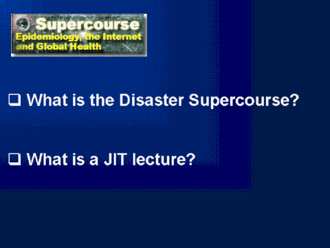 http://www.pitt.edu/~super1 www.pitt.edu/~super1/disasters/disasters.htm A global network of 18,000 academic faculty from 151countries. 2032 cutting edge lectures from leading scientists including 6 noble prize winner. The mission is to provide for free the best possible education materials on health, here it is applied to Tsunami disaster. For more information, please view the following lectures: Introduction to the Supercourse. By Ronald LaPorte http://www.pitt.edu/~super1/lecture/lec0012/index.htm Supercourse overview. By the Supercourse team http://www.pitt.edu/~super1/lecture/lec6961/index.htm Turning the Alley of Information Exchange in Developing Countries to the Super Highway. By: Ali Ardalan http://www.pitt.edu/~super1/lecture/lec16681/index.htm Just-in-time (JIT) lecture: ( http://www.pitt.edu/~super1/JIT/jit.htm ) A JIT lecture is one of the special applications of the Supercourse blossoms when a major event happens around the world. These Cutting Edge Educational lectures aim to reduce fear and save lives by providing the best possible knowledge. In the field of disasters, continuous "CNN Type" PowerPoint lectures are provided on the science aspect of disasters and the epidemiology of their consequences. When the earthquake in Bam, Iran 26 Dec 2003 occurred, Ali Ardalan from Iran worked with Eric Noji and Ronald LaPorte from the US, and Eugene Shubnikov from Russia. Dr. Ardalan developed a JIT lecture within few days (http://www.pitt.edu/~super1/lecture/lec13181/index.htm ) and updated it (http://www.pitt.edu/~super1/lecture/lec15221/index.htm ). That was a memorable collaboration, among Russia, Iran and the USA. This was published in the Lancet, and demonstrated how Global Disaster Training could be accomplished. The lecture was used world wide by thousands of educators and seen by a multitude of students. The JIT lecture by Rashid Chotani from Johns Hopkins demonstrated JIT lectures and emerging diseases. He worked with the Supercourse group, and updated the lecture every 2 days (http://www.pitt.edu/~super1/lecture/lec10131/index.htm ). This article was also published in the Lancet. We have honed our teachings with other JIT lectures including "Mad cow disease" and "Monkey pox". The model of JIT lectures develops a first lecture describing the