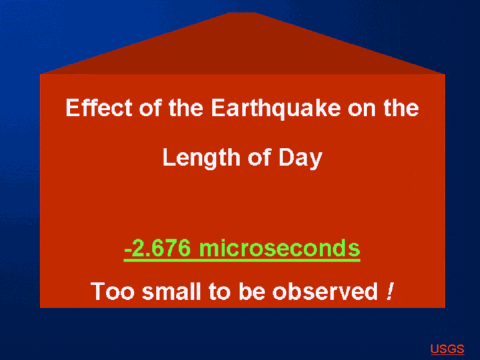 -2.676 microseconds Polar motion excitation X : -0.670 milliarcseconds Polar motion excitation Y: 0.475 milliarcseconds "Since the length of the day can be measured with an accuracy of about 20 microseconds, it is predicted that the change in the length-of-day caused by the earthquake is much too small to be observed. And, since the location of the earthquake was near the equator, the change in polar motion excitation is also rather small, being about 0.82 milliarcsecond in amplitude. Such a small change in polar motion excitation will also be difficult to detect. " Citation source: http://earthquake.usgs.gov/eqinthenews/ 2004/usslav/neic_slav_faq.html |