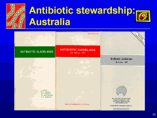 The solution was to bring together a group of microbiologists, physicians and pharmacists from a number of University Teaching Hospitals, lock them up in a small room with journals and MEDLINE printouts, and not let them out until they had come up with recommendations on the treatment of choice for common infections. And because drugs changed and germs changed and knowledge changed it was important to update this booklet at regular intervals. And as time passed, the recommendations were endorsed by one State Health Department, then by several, and ultimately it became a national project with a team of authors drawn from experts across the nation. Antibiotic use could now be judged against national standards of best practice. |