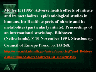 | Por otro lado, estudios de casos y controles basados en encuestas de frecuencia de comida tienden a mostrar un efecto de protección de la absorción estimada del nitrato al riesgo de cáncer gástrico. Probablemente esto sea debido al efecto de la fuerte protección conocida de verduras y frutas al riesgo de cáncer gástrico. |