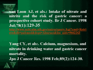 relación entre ellos. Yang y otros relacionaron la mortalidad por cáncer gástrico con la presencia de calcio, magnesio y nitratos en agua de beber, hallando asociación positiva con estos últimos. |