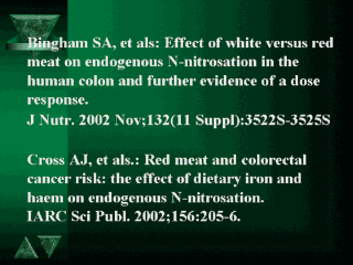 aprecio una dosis respuesta consistente con el consumo de nitritos. Cross y otros han estudiado el riesgo de cáncer colorectal inherente al consumo de carne roja, desde el enfoque de la N-nitrosación endógena. |