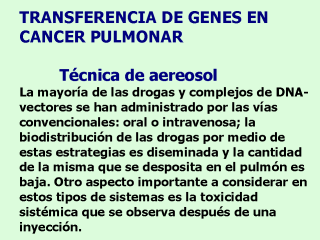 desarrollo de la terapia génica para una variedad de enfermedades humanas. La administración de una terapia génica y drogas quimioterapeuticas por un sistema de aereosol representa una tecnología con futuro para lograr que los productos lleguen específicamente y uniformemente a pulmón. Si se utilizan liposomas catiónicos por un sistema de aereosol muestra las siguientes ventajas: los liposomas catiónicos median eficientemente la transfección de células que no se dividen, esto es importante porque las células epiteliales del tracto respiratorio son muy diferenciadas y se dividen muy despacio o no del todo, en segundo lugar los liposomas no son infecciosos y no inmunogénicos. |