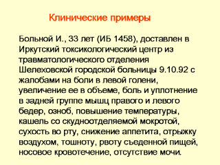 При поступлении: состояние средней тяжести, сознание сохранено, оглушенность. Кожные покровы обычной окраски, сухие, тургор обычный. Лицо слегка гиперемировано, одутловато. Левая стопа и левая голень увеличены в объеме, плотные, болезненные, кожа бледная, сухая. В глубине мягких тканей задней поверхности правого и левого бедер болезненные участки уплотнения. В легких дыхание везикулярное, в задне-нижних отделах единичные сухие хрипы, в боковых отделах слева единичные среднекалиберные свистящие хрипы. ЧДД 12 в мин. Тоны сердца аритмичные, приглушенные. ЧСС 64-68 в мин, АД 160/95 мм рт.ст. Язык обложен коричневатым налетом. Рвота небольшим количеством желудочного содержимого коричневатого цвета, живот мягкий, умеренно болезненный в эпигастральной и околопупочной областях. Печень у края реберной дуги. Симптом поколачивания слабо положительный с обеих сторон. Стула не было. Диурез отсутствует. Лабораторные данные: в крови - эритр. 3,2х1012/л, Нв 102 г/л, лейк. 7,6х109/л: п.- 1, с.- 87, л.- 6, м.- 6%, сахар крови 6,6 ммоль/л, Са 1,9 ммоль/л, хлориды 68 ммоль/л, креатинин 11 мг% (норма до 1,5 мг%), общий белок 61,2г/л; в моче - темная, мутная, белок 1,65 г/л, лейк. до 20 в п.зр. эритр. свежие и выщелоченные 6-10 в п.зр., цилиндры гиалиновые и восковые 1-3 и 0-1 в п.зр. Начато лечение: Стол 7, глюкозо-новокаиновая смесь, 1% р-р кальция хлорида - 200,0; курантил - 4,0 в 5% р-ре глюкозы - 200,0; 20% р-р глюкозы - 200,0; 2,4% р-р эуфиллина - 10,0; лазикс 80 мг в/в, 2% р-р папаверина - 2,0 в/м, 0,2% р-р платифиллина - 1,0 в/м, баралгин - 5,0 в/м, пенициллин 500000 ЕД в/м, 0,1% р-р промедола п/к по показаниям, парафин на область почек. На фоне проводимого лечения в течение суток состояние оставалось без положительной динамики, сохранялась рвота. Суточный диурез составил 60 мл. 10.10 больному наложен артерио-венозный шунт на левом предплечье. Проведена операция гемодиализа, уровень креатинина до диализа 13,5 мг%, после диализа - 7 мг%, диурез за сутки 100 мл. Всего больному проведено 7 сеансов гемодиализа, 3 сеанса искусственной изолированной ультрафильтрации в ходе которых удалено 7000,0 жидкости. На фоне проводимого лечения у больного сохранялась олигоанурия (СД 150,0 - 250,0), креатининемия (уровень креатинина 11,5 - 13,5 - 11,5 - 12,5 - 9,5 - 10,5 - 4,0 мг%), анемия (уровень эритроцитов 3,0х1012/л - 2,8х1012 /л - 2,2х1012 /л - 3,0х1012/л), гиперкалиемия до 5,3 ммоль/л, гипопротеинемия - 53,5г/л, нарастали явления гипергидратации. Период олигоанурии продолжался в течение 13 суток. Восстановление диуреза началось с 14 суток (СД 1300,0 - 1700,0 - 1500,0 - 2500,0) Прекращены сеансы гемодиализа и ультрафильтрации. Проведены трансфузии свежезамороженной плазмы, эритроцитарной массы. С 21.10 (17 сутки) началась полиурическая фаза (СД 4000,0 - 7000,0 - 12000,0). Проводилась коррекция водно-электролитного баланса. На 25 сутки у больного сохранялись явления ишемической нейропатии левого большеберцового нерва. Проводились физиопроцедуры, вводились витамины группы В, прозерин, экстракт алоэ. Выписан через 45 суток в удовлетворительном состоянии. |