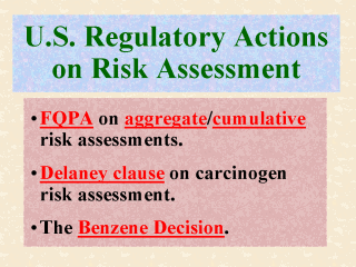 exposure (U.S. EPA, 1999a) and cumulative risk assessment (U.S. EPA, 1999b). The Delaney amendment to the Food, Drug, and Cosmetic Act states that food additives that cause cancer in humans or animals at any level shall be prohibited from such use. It was partly in response to this Delaney clause that U.S. FDA has attempted to use the excessive cancer risk of 1 in 1,000,000 as the benchmark for considering the extrapolated risk dose of a food-packaging material to be de minimus (insignificant). U.S. OSHA’s previous standard policy, on the other hand, was to try to reduce the (typically air) levels of carcinogenic agents in the workplace as far as technologically feasible. Yet shortly on OSHA’s 10th birthday, the U.S. Supreme Court overturned its benzene standard on grounds that the agency had failed to associate a significant risk of harm to the chemical’s prevailing concentrations in the workplace (Benzene Decision, 1980). |