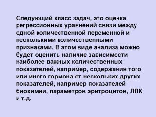 | Отметим, что кроме линейных множественных регрессионных уравнений здесь имеет смысл произвести и оценку нелинейных уравнений регрессии. Наиболее эффективно применение уравнений регрессии в том случае, когда требуется произвести прогноз значения количественного признака, прямое измерение которого очень дорого и трудоемко, используя для этой цели несколько количественных характеристик измеряемых достаточно точно и быстро. |