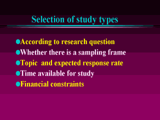 about selecting your study type? It obviously depends on what question you are trying to answer, whether you are lucky enough to find a source that covers your target population, and whether you are allowed access to the data. Alternatively, you may find that the group you are after is homeless people and they are not listed anywhere and are not contactable on the phone or may use different names on various registers. For some topics (e.g. attempted suicide, or sexual behaviours) you may be restricted in the type of population you can approach, even if the event happens across all genders, socio-economic class and age-groups. For example, older people would be less likely to participate in a survey addressing those sensitive topics. Likewise, young people may not be interested in responding to questions about health beliefs and diabetes, which are not exciting and require some knowledge. Finally (and sometimes this is the determining factor) you may have designed a grand survey and have access to the sampling frame but your resources or your deadline for delivering the report do not allow you to use good techniques or good data sources. In which case I would recommend you undertake a pilot study or do not conduct the study at all. |