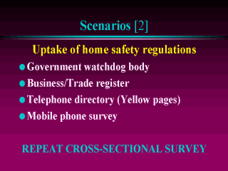 legislation for the building industry (e.g. smoke alarms and hot water regulators). Obviously ringing the population at random would be too costly as the regulation only applies to newly built homes (say in the last 12months). The first step is to find out if there is a government or private body holding information on the target group (new building owners or building companies). Usually occupational groups have a union or professional register including a majority of those holding permits to work in the area. If this does not exist, the telephone directory could help identify a proportion of those, but obviously excludes business too small to afford advertising, or businesses base don mobile numbers only, and definitely, those trading illegally in the building industry. A survey of registered business numbers and mobile phone numbers could cover a greater proportion of the target group. THE IMPORTANT POINT IS THAT YOU CONDUCT THIS SURVEY BEFORE THE INTRODUCTION OF LEGISLATION AND REPEAT IT SEVERAL MONTHS OR YEARS AFTER THE IMPLEMENTATION. |