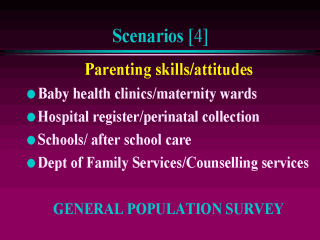 attitudes among parents in the community. How do you go about estimating this? After defining the domains to be explored, developing and pilot testing the questionnaire, decide which type of parents you will be focusing on and then select your sampling frame: 1) Parents of babies: conduct interviews (random or consecutive) among parents using well-baby clinics, maternity wards or examine the perinatal collection and follow-up. 2) Parents of sick children: data can be gathered from paediatric hospital services, or the hospital register for retrospective follow-up. 3) parents of pre-school or school age children:approach school principals, child care centres, and after-school care facilities to access parents. You could send the questionnaire home with the kid and have it returned the following day. 4) Parents of children with physical or mental disabilities: if you manage to get ethics approval to access the cases, or build partnerships with relevant government or clinical services, the questionnaire could be administered by the service providers. ALL THE ABOVE OPTIONS WILL YIELD NON-REPRESENTATIVE SAMPLES, SO YOUR BEST BET IS A POPULATION SURVEY TO IDENTIFY HOUSEHOLDS WITH PARENTS OF CHILDREN IN YOUR TARGET AGE GROUP. |