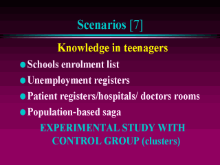 to give you a representative sample. What do you settle for? 1) School enrolment lists will clearly identify gender, age, socio-economic group (parental income, area of residence, race, etc) of individuals but will obviously exclude 13-17 year-olds who have left school or never enrolled. 2) Unemployment registers will provide similar profile for the school leavers but will also miss out on those teenagers who choose not to register when unemployed. 3) Hospital and other patient registers may identify that other proportion of teenagers who don’t study or work or may not live at home. 4) As all of the above only represent a sector of your community of interest, a population based survey would be best. However, trying to identify households with teenagers may consume time and your budget quickly. WHATEVER YOUR CHOICE (DEPENDING ON THE TOPIC AND TARGET SUB-GROUP) ENSURE YOU INCLUDE A CONTROL GROUP IF YOU ARE EVALUATING THE IMPACT OF AN EDUCATIONAL INTERVENTION. |