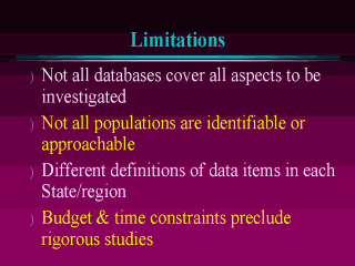 interest. Further, not all groups are easy to access (e.g. those only on mobile phones, the homeless, the reluctant elderly, the youngster who is never at home to be interviewed). If intending to compare data across states or other geographic areas to obtain prevalence, you may find that other projects have different definitions of “elderly”, “teenagers” and “women of reproductive age”. Select an agreed standard definition used in the literature by others so you can compare your parameters with other studies. This may not always be possible. Finally, sometimes less technical and more practical issues sucha as timeliness and budget restrictions may be the reason why you cannot undertake a perfectly rigorous study. At times, political pressure may lead you to settle for the second best option. The important issue is that you acknowledge these limitations when you are writing the report. |