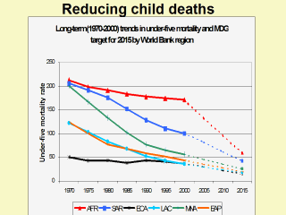 achieved: 3.5 million children saved by 2005, over 10 million by 2010 But on current trends: 68/78 low-income countries will not reach the MDGs Africa and South Asia farthest away Causes: ARI, malaria, diarrhea, measles