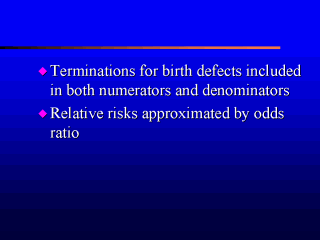 | Perinatal deaths were included into denominators date. The data was adjusted for maternal age and birth order by logistic regression and relative risk was approximated by odds ratio. The exact inference methods was used for both confidence intervals and P-values for differences between relative risks. |