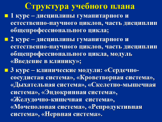 и гинекология», «Педиатрия». 5 курс – клиническое обучение по узким разделам; 6 курс – «семейная медицина». |