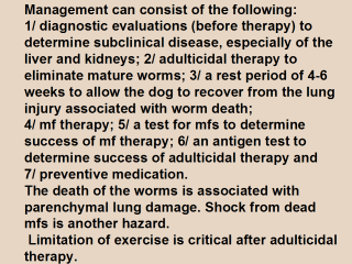 Melarsomine (2.5 mg/kg, 2 IM doses over 24 hr) has improved efficacy (>95 % kill). However, increased worm death can cause serious complications. One IM dose followed 1 month later by 2 IM doses is a safer alternative. |