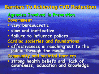 gaining acceptance at nation wide level. Similarly, American Heart Association (AHA)/American College of Cardiology (ACC), National Heart, Lung and Blood Institute, British Heart Foundation, Heart Foundation of Australia and New Zealand, the European Society of Cardiology and the European Heart Network have been very effective in reaching out to the public through the media. However, governments are usually very bureaucratic, slow and ineffective. To give an example, for the past several years the Pakistan cardiac society have been knocking at the doors of the Government of Pakistan for a hearing and a policy statement on heart disease. Governments, especially in the developing countries, can do a lot by way of legislation against the use of tobacco for e.g. and for labeling of processed foods to declare their fat and sodium content. The government must have the political will to eradicate the disease by proper transfer of technology to the states. The Government of Pakistan has failed to provide an impetus to eradicate RHD as it mostly affects the poor. The fundamental contribution of lifestyle behaviors to the prevention and reduction of risk factors, and the high prevalence of risk factors in most population groups, mandate a public health approach to preventing CVD. In countries are Pakistan, communities carry very strong beliefs food rich in fat. E.g saturated fat is better than oil etc. The influence of myths on patient behavior and the effect of dispelling myths are important areas for study. The emphasis in medical school and training is on diagnosing and treating acute illness. Physicians receive very little education in public prevention and the management of chronic conditions. Cardiologists, in particular, often view their role as managing the acute event; they frequently defer long-term prevention issues to primary care providers. the lack of specialist attention reinforces the perception on the part of primary care providers and patients that the treatment of chronic risk factors and lifestyle modification are discretionary practices. |