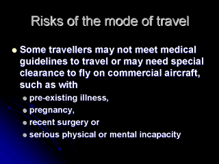 | Some travellers may not meet medical guidelines to travel or may need special clearance to fly on commercial aircraft, such as with pre-existing illness, pregnancy, recent surgery or serious physical or mental incapacity. |