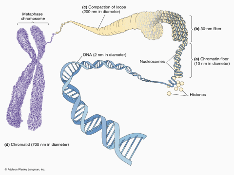 | The steps in eukaryotic chromosomal compaction leading to the metaphase chromosome. The DNA double helix is wound around histone proteins and then further compacted to form a highly condensed metaphase chromosome |