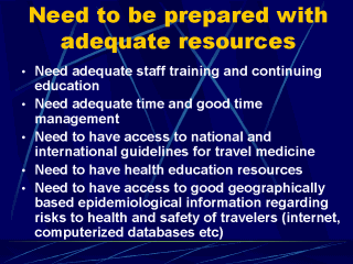 | Practices and clinics need to be prepared and have adequate resources and personnel to provide travel health advice. |