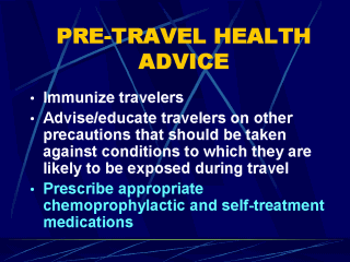 | Finally, the pre-travel health consultation is an opportunity to look at medications and other prescription items that may be needed by the traveler. |