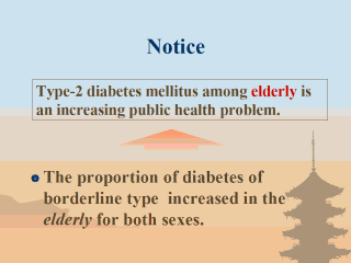 Prevalence of diabetes of borderline type increased in the elderly for both sexes. Therefore, diabetes mellitus among elderly is an increasing public health problem.