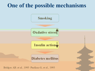 | A causal relation between smoking and type-2 diabetes mellitus is plausible, for several reasons. Smoking increases oxidative stress, which has been implicated in the causation of diabetes mellitus. |